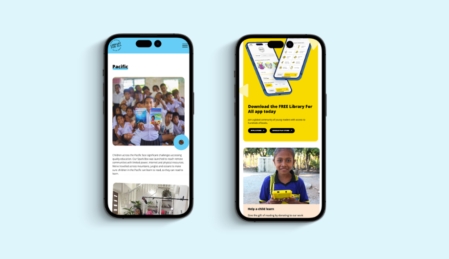 When it came to UI design, we had the opportunity to broaden and evolve Library For All’s visual language through new illustrations and visual treatments. Our aim was to capture the innovative, digital side of their work in an interactive and playful way, while remaining true to their cross cultural work. We created a unique digital world using bright, bold colours, playful illustrations, and interactive elements to explore features of their products and services.