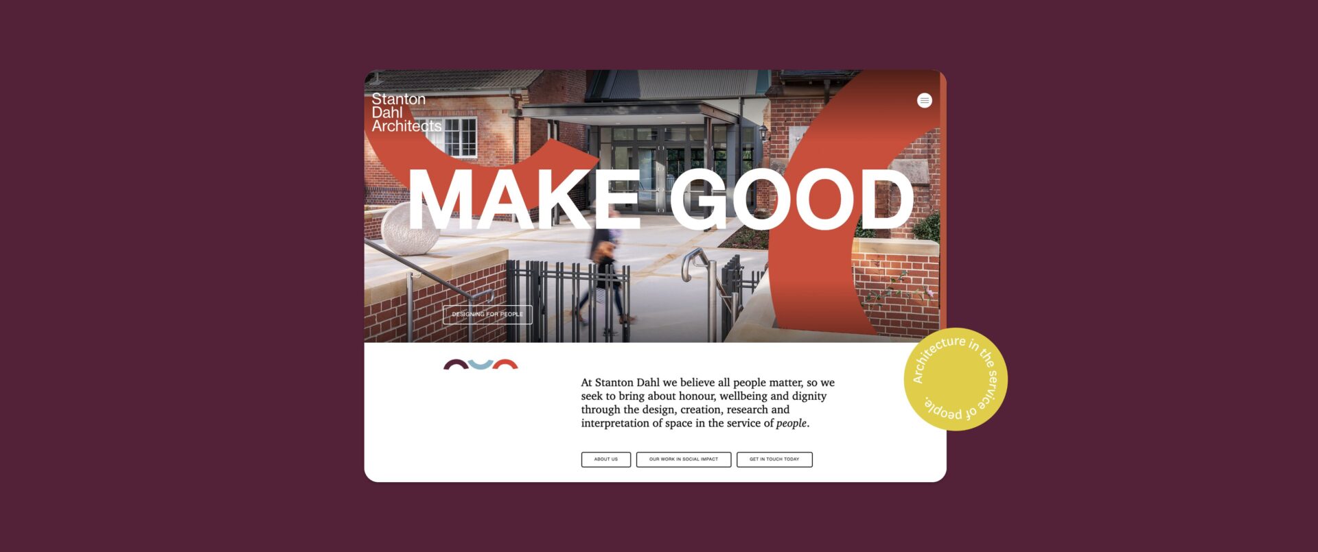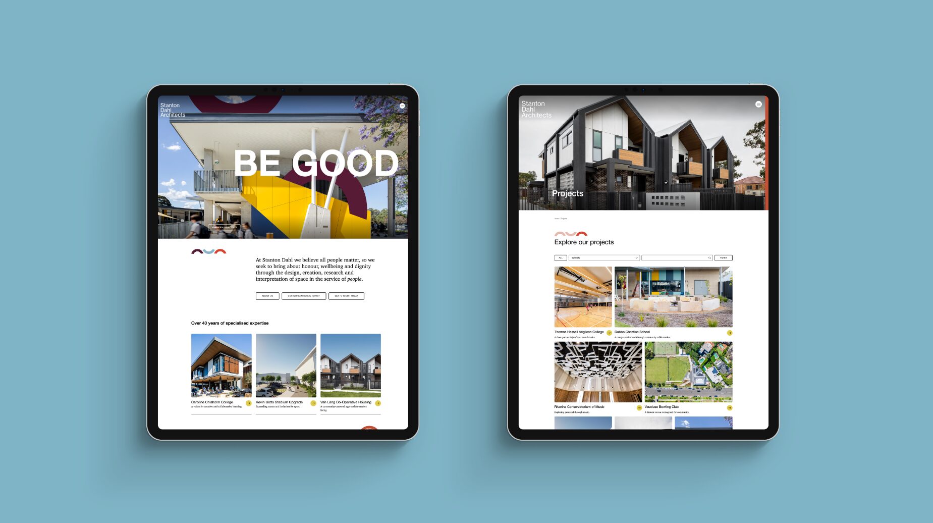 We were approached by Stanton Dahl Architects to design a bespoke web experience, focusing on their key messaging of ‘Designing for the greater good.’ We were required to use the existing brand elements and extend their messaging and visual identity further in a digital space. Designing a unique website for architecture was an appealing challenge. The website needed to be minimal enough to showcase the building projects, but have enough warmth and creative personality to stay true to their brand.