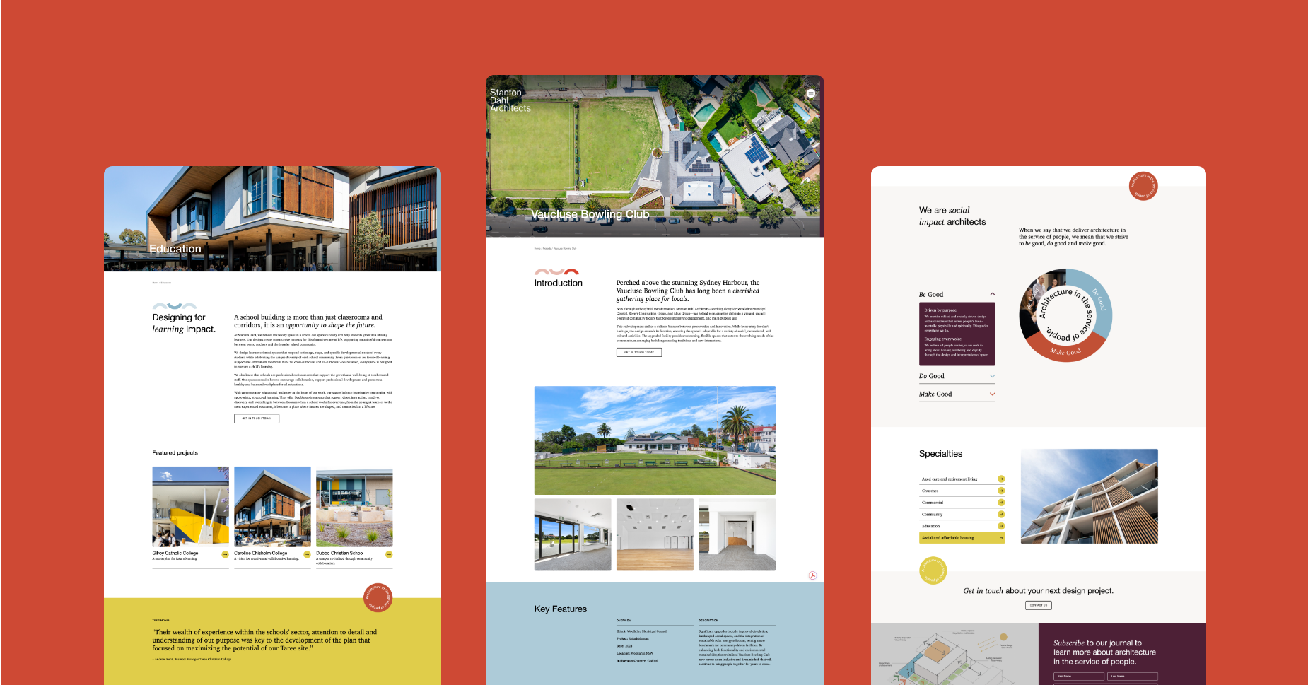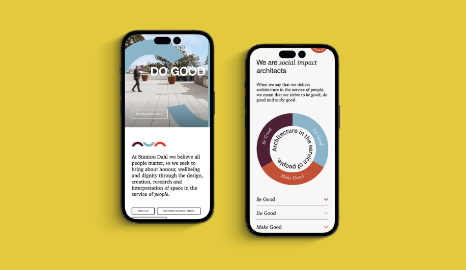 To deliver a successful design solution, we collaborated with Stanton Dahl to understand their objectives for the website and creative outcomes. We conducted competitor research, user profiles and a functionality audit. We found that users of the site include potential and existing clients, industry peers, potential partners, project managers and staff. A key opportunity uncovered by the research was to lean into Stanton Dahl’s storytelling focus, driven by their passion for social impact – something that set them apart from the competition. This was key in our approach in developing a visual system and overarching message for the website.